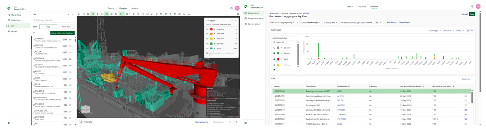 Bad actor analysis. With all work history tied to the tag and visualised in 3D, operators are now performing what we call “visual root cause analysis.” By heatmapping historical corrective work across the asset, one FPSO team identified clusters of repeat failures around a specific system, Fig. 4. This led to a targeted engineering review that uncovered a persistent issue—one that might have gone unnoticed in spreadsheets.