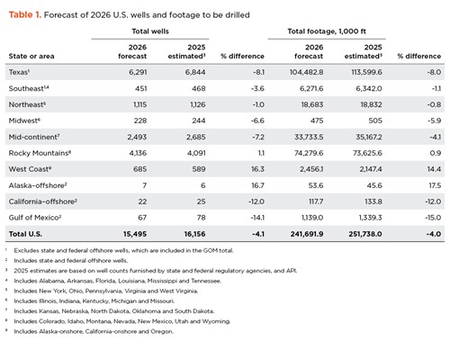 The above-mentioned factors, along with World Oil’s surveys of operators and state agencies, have all shaped this U.S. forecasting process. Accordingly, World Oil predicts that both U.S. drilling and footage will decline by 4% in 2026, Table 1 and Fig. 4. We expect 15,495 wells and 241.7 MMft of hole.