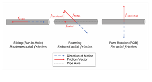 When reach limits of these commonly used sliding methods are encountered, rotation can be used as another effective mechanism for reducing axial friction. When a casing string is rotated as it is run in hole using a top-drive Casing Running Tool (CRT), friction at downhole contact points acts in the opposite direction to motion at the borehole interface, as shown in (Fig. 1). This means that rotation reduces sliding resistance into the hole, increasing available hookload. This also creates rotational drag that must be overcome by applying torque to the string at surface. Rotation can be employed in conjunction with flotation, in which case better hole conditioning prior to the casing run can aid overall execution. The practice of rotating air-filled casing, known as "dry reaming," is becoming more widely adopted in extreme ERD wells in attempts to further reduce drag and maintain hookload to TD.