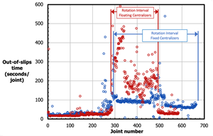 One other advantage that has been seen is more consistent slip-to-slip times per joint during the rotation interval. This predictability can be used to forecast running times and maximize weight on bit right up to TD, further optimizing casing running operations. (Fig. 7) shows the in- and out-of-slips times for the crimped centralizer run introduced earlier. When comparing the out-of-slip running times between the floating and crimped runs in the rotation interval, a vast reduction in running times and an obvious increase in consistency are seen with the crimped solution.
