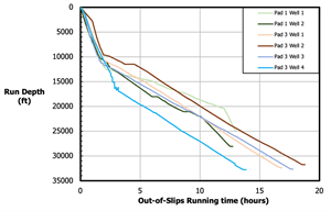 Adopters have commented on the security that installation has created in the planning and execution phase of their casing running operation, and this is reflected in the consistency of out-of-slips running times for sample wells (Fig. 8). One drilling and completions manager stated that the use of the solid body crimp-on centralizers has “allowed them to push lateral lengths from 20,000 to 25,000 feet.”